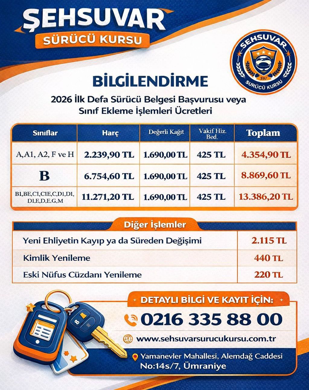 Ümraniye Sürücü Kursu, alanında uzman ekibi ve profesyonel eğitimleri ile kaliteli hizmetin adresi. Size en uygun sürücü kursu fiyatları ile kaliteli direksiyon dersi eğitimleri vererek trafiğe kazandırmak en büyük hedefimiz. Sürücü kursu için gerekli belgeler tedariği konusunda her zaman yardımınıza koşan Ümraniye Sürücü Kursu, sürücü kursu sınavında başarılı olmanız için size en iyi hocalar ile eğitim seçeneği sunuyor. Motosiklet ehliyeti, otobüs ehliyeti, minibüs ehliyeti, otomobil ehliyeti için Ümraniye sürücü kursu telefonu üzerinden iletişime geçebilirsiniz.